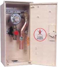 | C 3125RSPESC | Coffret S300 16m3/h Entrée PE DN 15 Robinet de sécurité DN15 Régulateur B25N sans compteur Crosse de sortie cuivre DN32 |